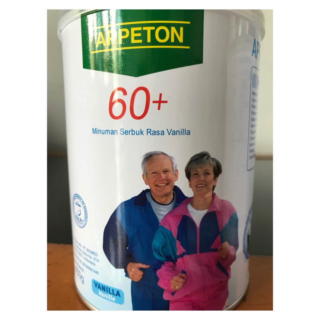 Appeton 60+ adalah nutrisi lansia dengan usia 60 tahun ke atas untuk meningkatkan nafsu makan, menambah berat badan, membantu penyerapan protein, dan mengurangi resiko kekurangan nutrisi. Appeton 60+ dilengkapi dengan mikronutrien dan makronutrien untuk memenuhi kebutuhan nutrisi harian dan mengurangi resiko kekurangan nutrisi. Mengandung proteplex yang aman untuk ginjal, bekerja secara bertahap untuk tubuh sehingga tidak membebani kerja ginjal. Mengandung kromium untuk menjaga kadar gula darah agar tetap normal. Sesuai dengan standard American Heart Association (AHA) bebas kolesterol dan asam lemak trans untuk tetap menjaga kesehatan jantung. Mengandung inulin membantu meningkatkan fungsi sistem pencernaan dan pertumbuhan bakteri yang baik.Golongan: Nutrisi
