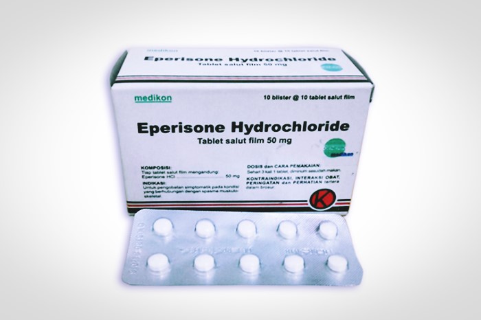 Eperisone HCl bekerja sebagai relaksan otot atau melemaskan otot rangka dan otot polos vaskular, yang menghasilkan pengurangan myotonia, peningkatan sirkulasi, dan penekanan refleks rasa sakit. EPERISONE digunakan untuk pengobatan simtomatik terhadap kondisi yang terkait dengan spasme muskuloskeletal atau kejang otot. Penggunaan obat ini HARUS SESUAI DENGAN PETUNJUK DOKTER.